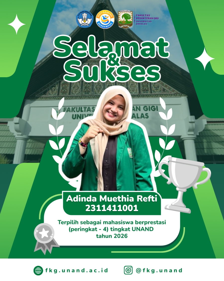 Dengan capaian ini, diharapkan Adinda Muethia Refti dapat terus mengukir prestasi di tingkat yang lebih tinggi serta membawa nama baik Fakultas Kedokteran Gigi Universitas Andalas ke kancah yang lebih luas.